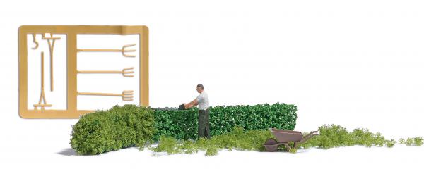AS taille de haie Jardinier avec taille- haie, brouette et outils de jardin