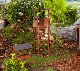 Mirador de construction en bois, protégé par un toit, avec un râtelier à fourrage assorti permettant de nourrir le gibier.