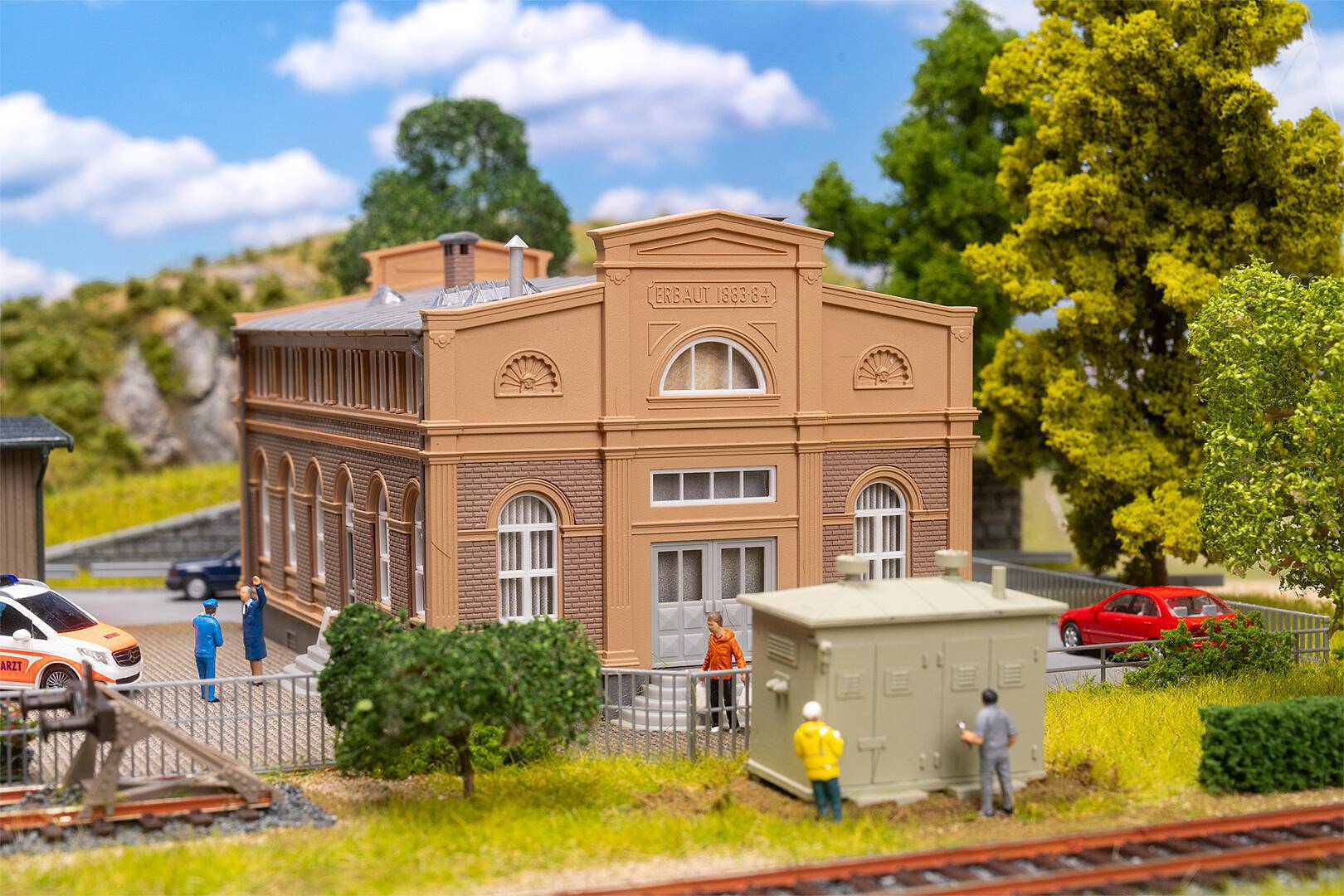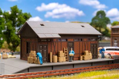 Action set Manutention marchandise Ce set d'action transforme chaque gare en un authentique lieu de transbordement de marchandises! Le bâtiment administratif en briques de couleur sable assure l'ordre dans le déroulement de l'exploitation, tandis que la remise à marchandises aux murs de briques rouges sert d'entrepôt intermédiaire pour les marchandises. Un simple hangar en bois, une maisonnette pour le transformateur et une station-service pour le diesel complètent la scène - parfait pour une logistique d'ambiance en miniature.