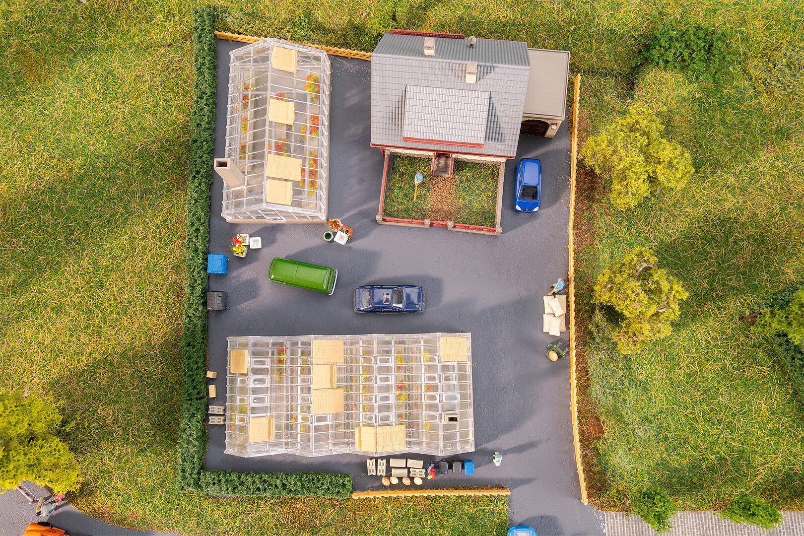 Action set Village Le vent porte doucement le son des cloches de l'église sur le paisible village miniature. Il provient d'une petite église de village blanche au toit pentu, qui veille sur le décor. Juste à côté se trouve une charmante maison individuelle en pierre avec un petit jardin devant et une fontaine avec une figurine. Dans les serres voisines, tout pousse et fleurit - toutes sortes de plantes s'ébattent. Une idylle rurale en miniature.
