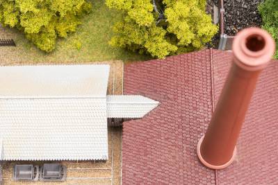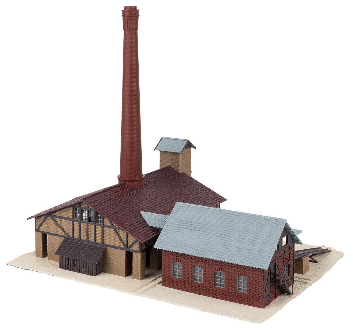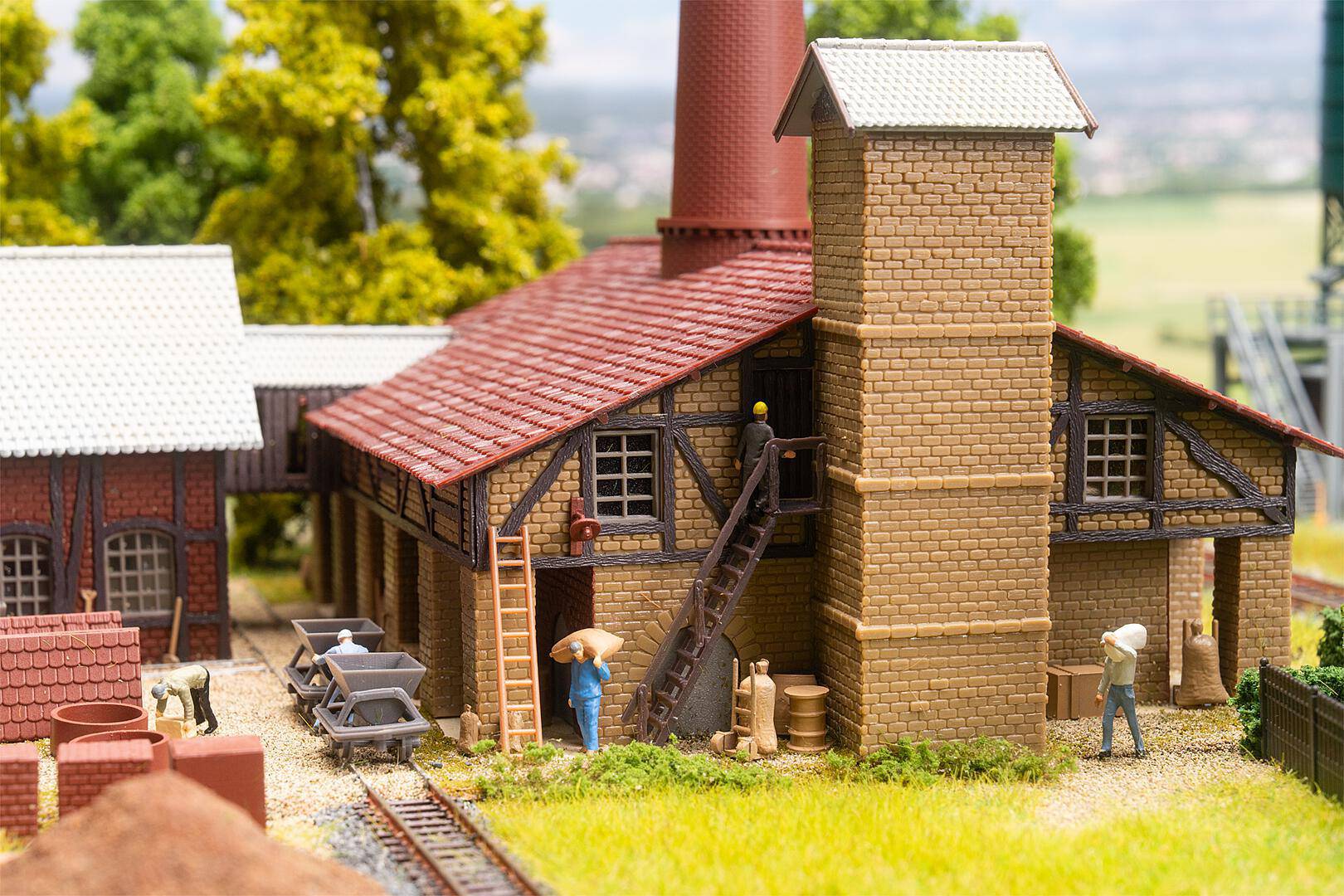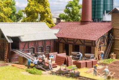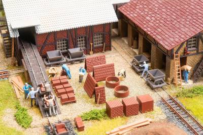 Briqueterie Modèle à plusieurs pièces composé d’un bâtiment principal avec chambres de combustion, fourneaux et cheminée, ainsi que remise sèche pour les tuiles brutes. Avec voies à rails et de nombreuses pièces décoratives, telles que charrettes à bras et brouettes, wagonnets, échelles, piles de tuiles, etc.