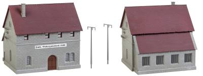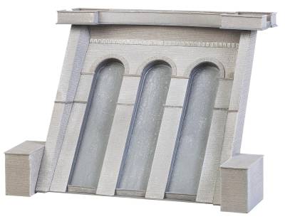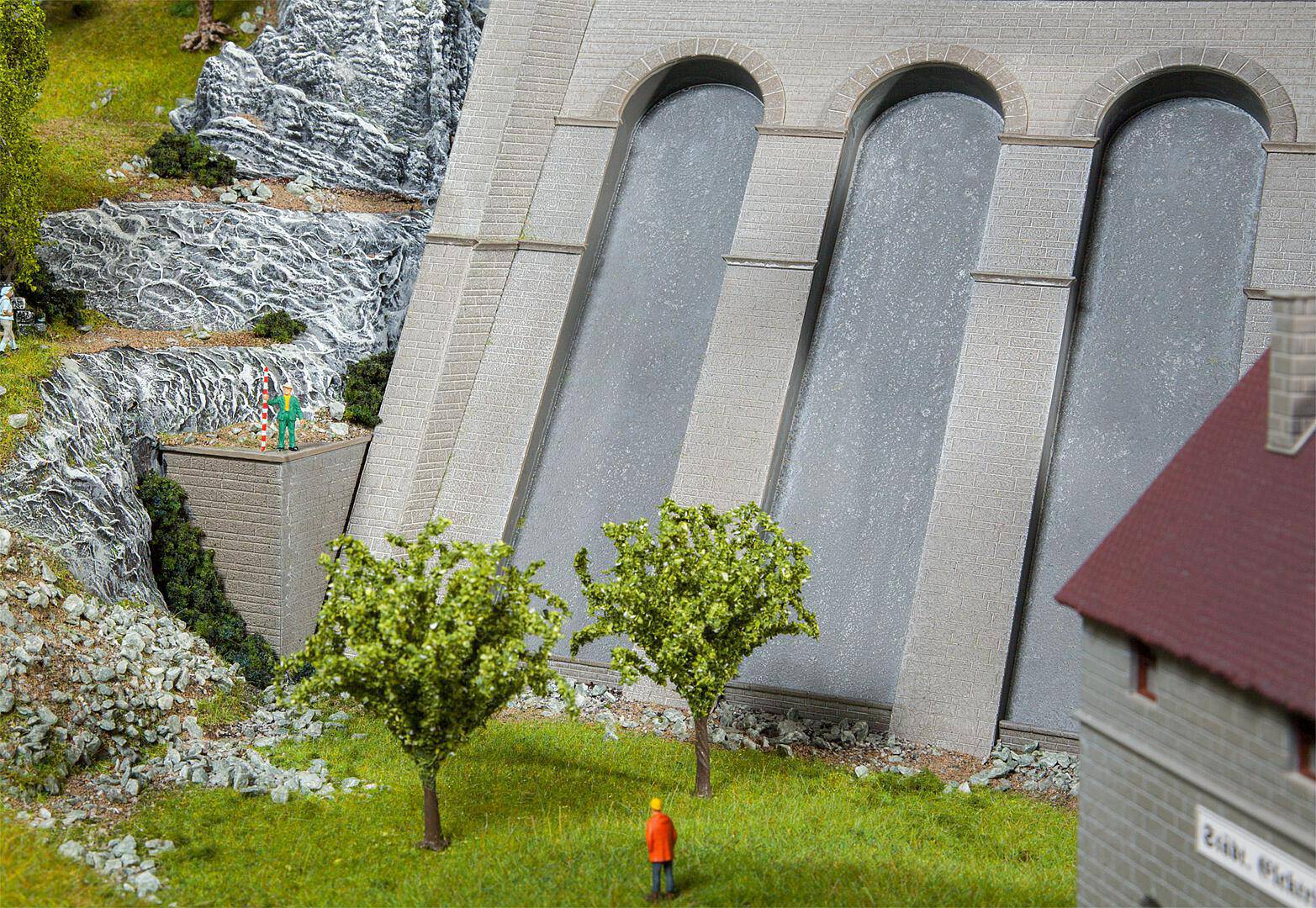 Centrale electrique avec barrage Centrale électrique historique des débuts de l’électrification. Ce bâtiment en pierre massif à deux étages, les fenêtres avec arcs en plein cintre et son annexe à l’aspect de nef latérale inspirée de constructions sacrées reflètent tous l’enthousiasme des premiers temps pour la technique. Des isolateurs et deux pylônes font partie du kit. Le barrage servant d’ouvrage de retenue et permettant la production d’électricité comprend un mur à contreforts et d’un chaperon praticable en surplomb. Vous trouverez d’autres mâts de lignes électriques qui conviennent (Art. F180928) dans notre assortiment de petites pièces.