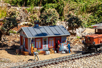 Commerce de boissons rural avec grandes fenêtres et toit à deux versants. Des accessoires d’aménagement tels que tables et bancs de brasserie, fûts, caisses à boissons, et bouteilles agrémentent le modèle.