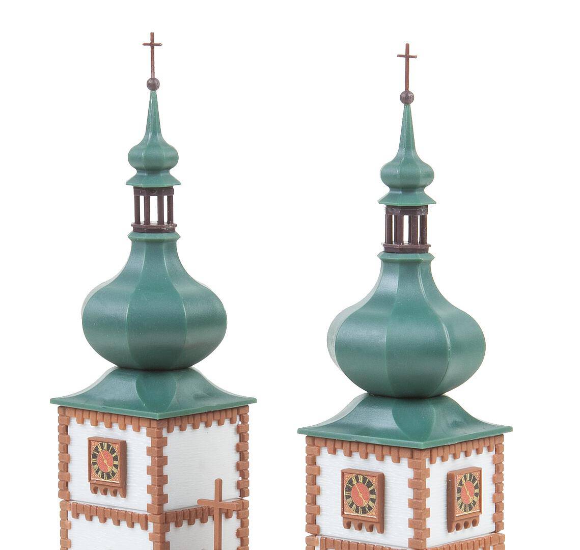 Eglise urbaine N Grande église urbaine à deux clochers, avec nef rallongée, une abside demi-circulaire, entrée de sacristie annexée et vitraux aux beaux coloris éclairables. Le kit comprend en sus des lanterneaux de clocher en poivrière et en bulbe ainsi que des croix et des pointes de clocher.