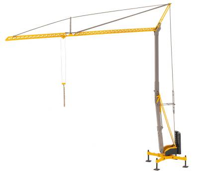 Grue de construction Montage dans le bâtiment ! Grue fixe à tour pivotante servant d’auxiliaire de levage et de manutention sur les chantiers et terrains à bâtir, comprenant un châssis porteur à pieds escamotables et contrepoids, tour rabattable et flèche.