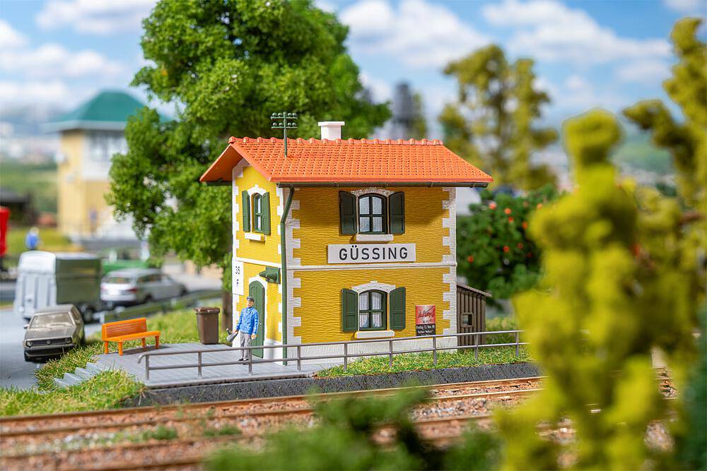 Tout comme la gare Güssing, cette maisonnette de garde-barrière séduit par ses couleurs vives d'un jaune pétillant - un véritable accroche-regard sur chaque réseau. Le socle, les corniches et les frises sont imprimés numériquement et apportent des accents blancs. Idéal pour donner un coup de jeune au paysage ferroviaire miniature.