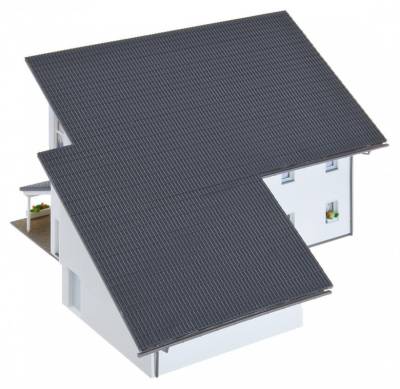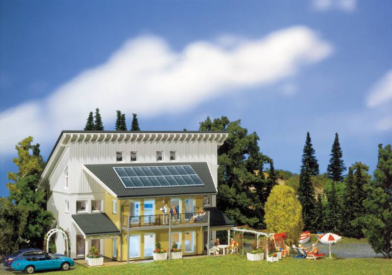 Maison solaire Maison individuelle. Construction visant à favoriser les économies d’énergie, toit très bas à un versant, balcon à garde-corps en pièces décapées, pièces ouvertes très claires.