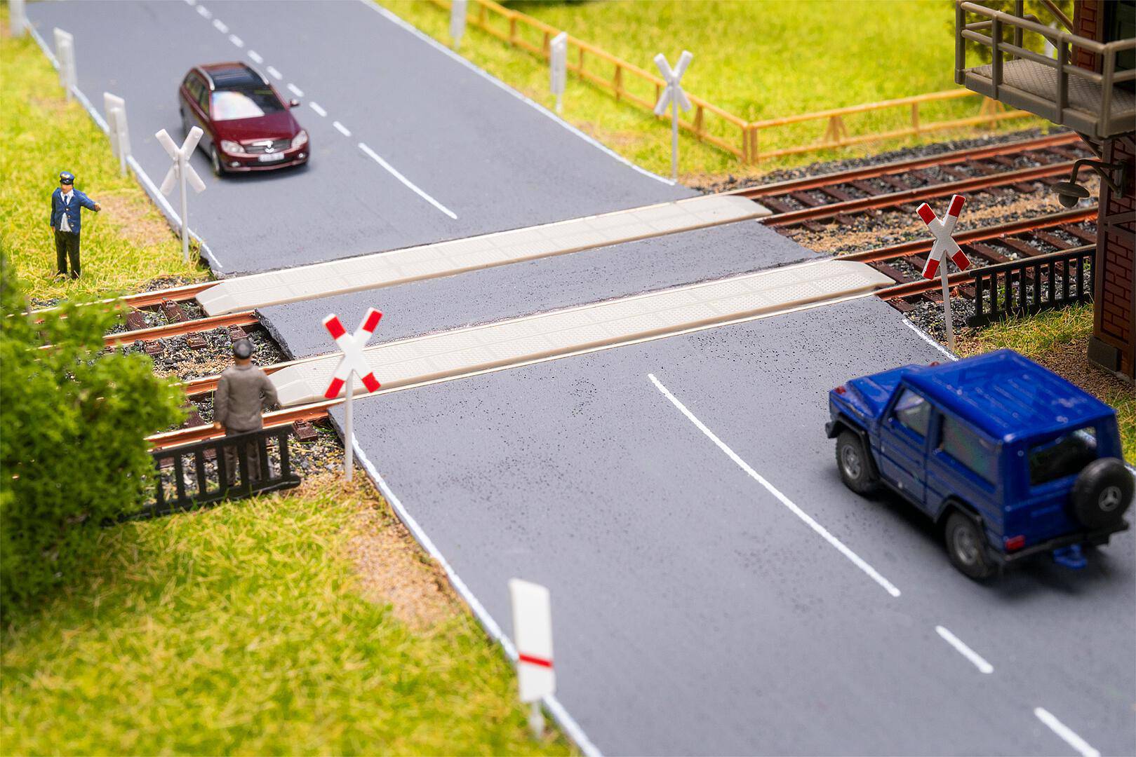 Passage à niveau sans barrière Convient pour la construction de deux passages à niveau sans barrières individuels ou d’un passage à niveau sans barrières à double voie. Convient pour les voies centrales et le système Car System.