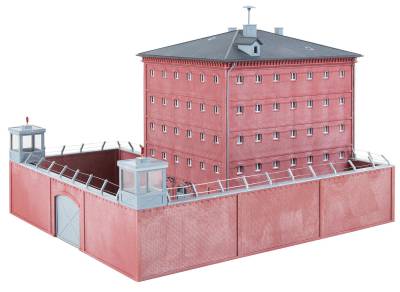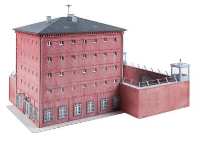 Prison Établissement pénitentiaire dans un bâtiment en briques à cinq étages à base carrée et toit en pavillon plat. Les éléments décoratifs modestes de la façade sont des corniches et moulures ainsi qu’une frise dentelée sur tout le pourtour sous la gouttière. Des hauts murs avec un portail d’accès forment la cour de la prison qui borde deux côtés du bâtiment.