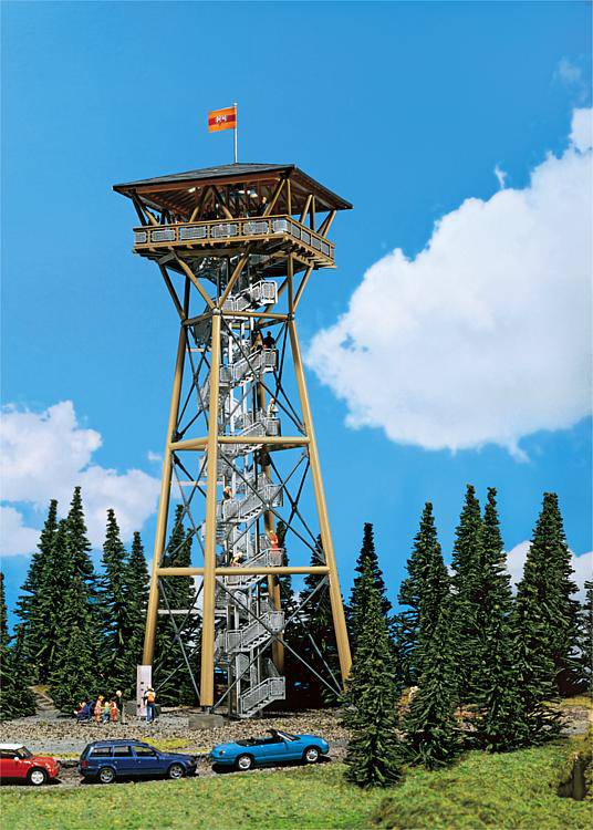 Tour d'observation riesen Imposante construction en bois avec montée d’escalier intérieure et plate-forme panoramique couverte. L’original se trouve sur le Riesenbühl à proximité du lac Schluchsee/Forêt Noire. Bâtie une première fois en 1931, la tour s’est écroulée lors d’une tempête en 1945. À la fin des années 70, on l’a rebâtie avec du bois de douglas garantissant sa résistance aux tempêtes. Il faut gravir plus de 140 marches pour atteindre la plate-forme offrant un fantastique panorama de la Forêt Noire.